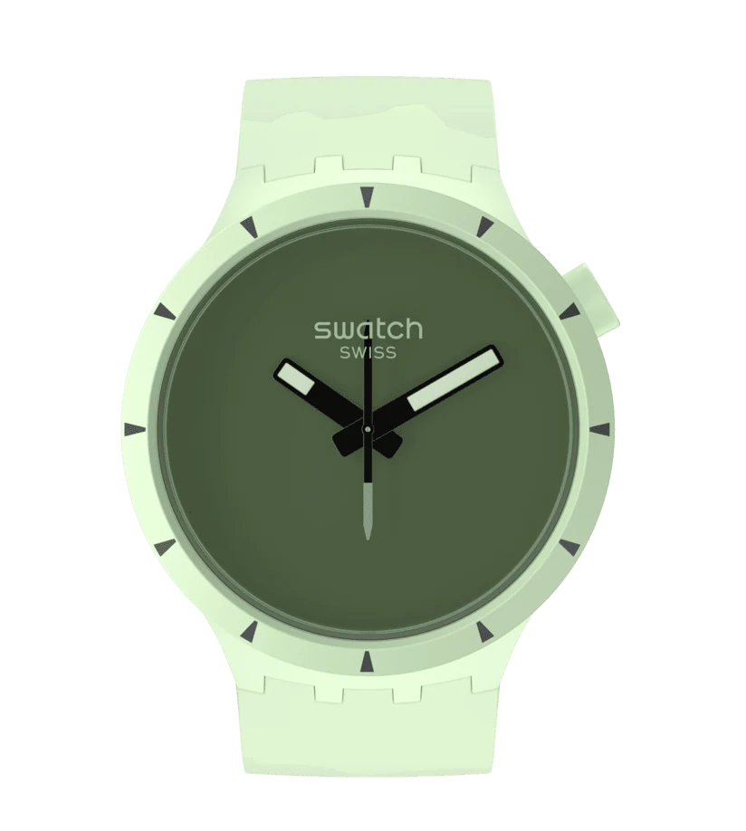 Cette BIG BOLD BIOCERAMIC est dotée d’un bracelet en silicone vert mat avec impression vert clair, et d’un boîtier et d’une lunette en matériaux biosourcés vert mat. Le cadran vert foncé accentue le trait blanc très lumineux des aiguilles noires. Inspirée de l’aiguille de boussole, la trotteuse marque encore plus le sens de l’aventure.
