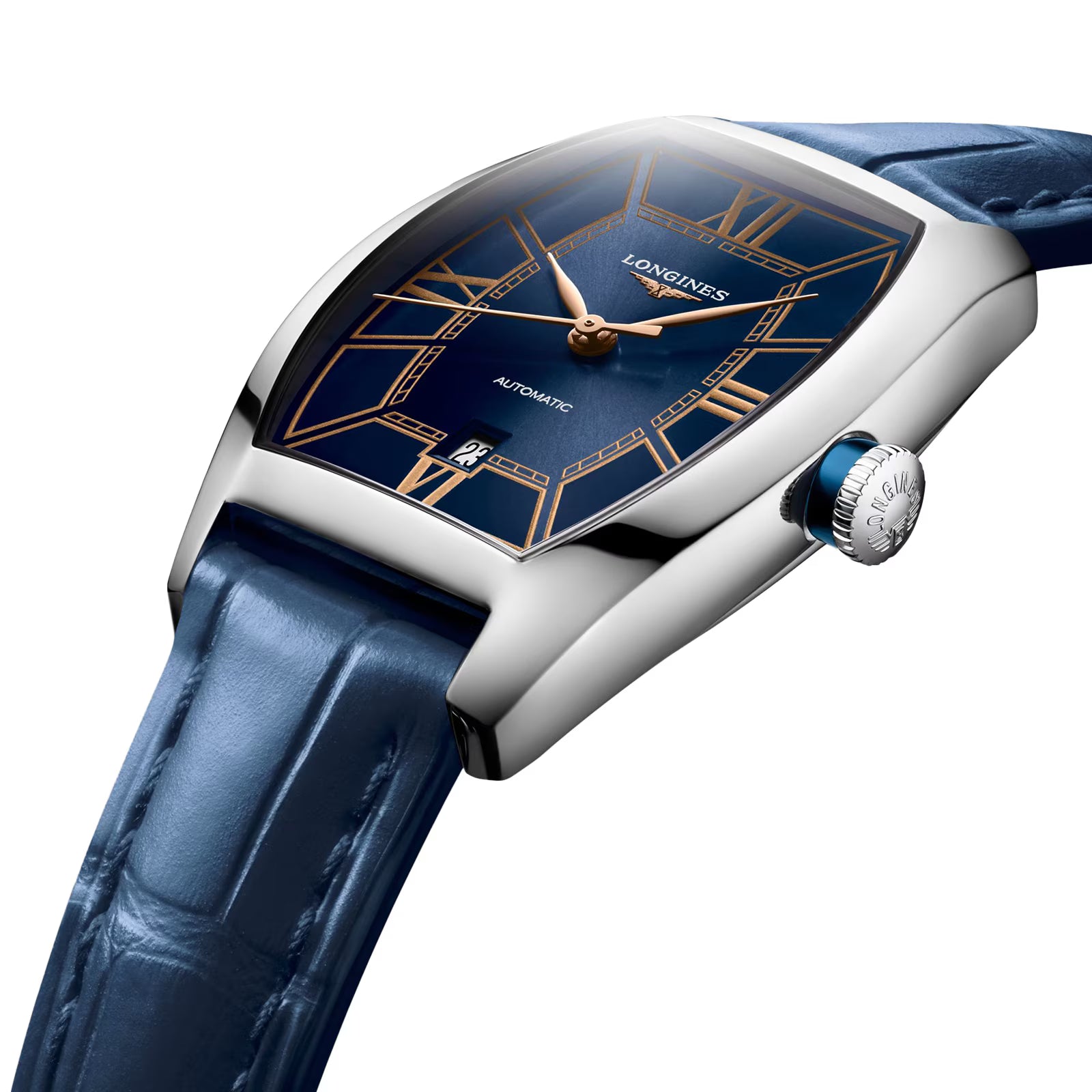 Dotée d’un boîtier distinctif de forme tonneau en acier inoxydable, la Longines Evidenza est présentée sur un somptueux bracelet en cuir d’alligator bleu.