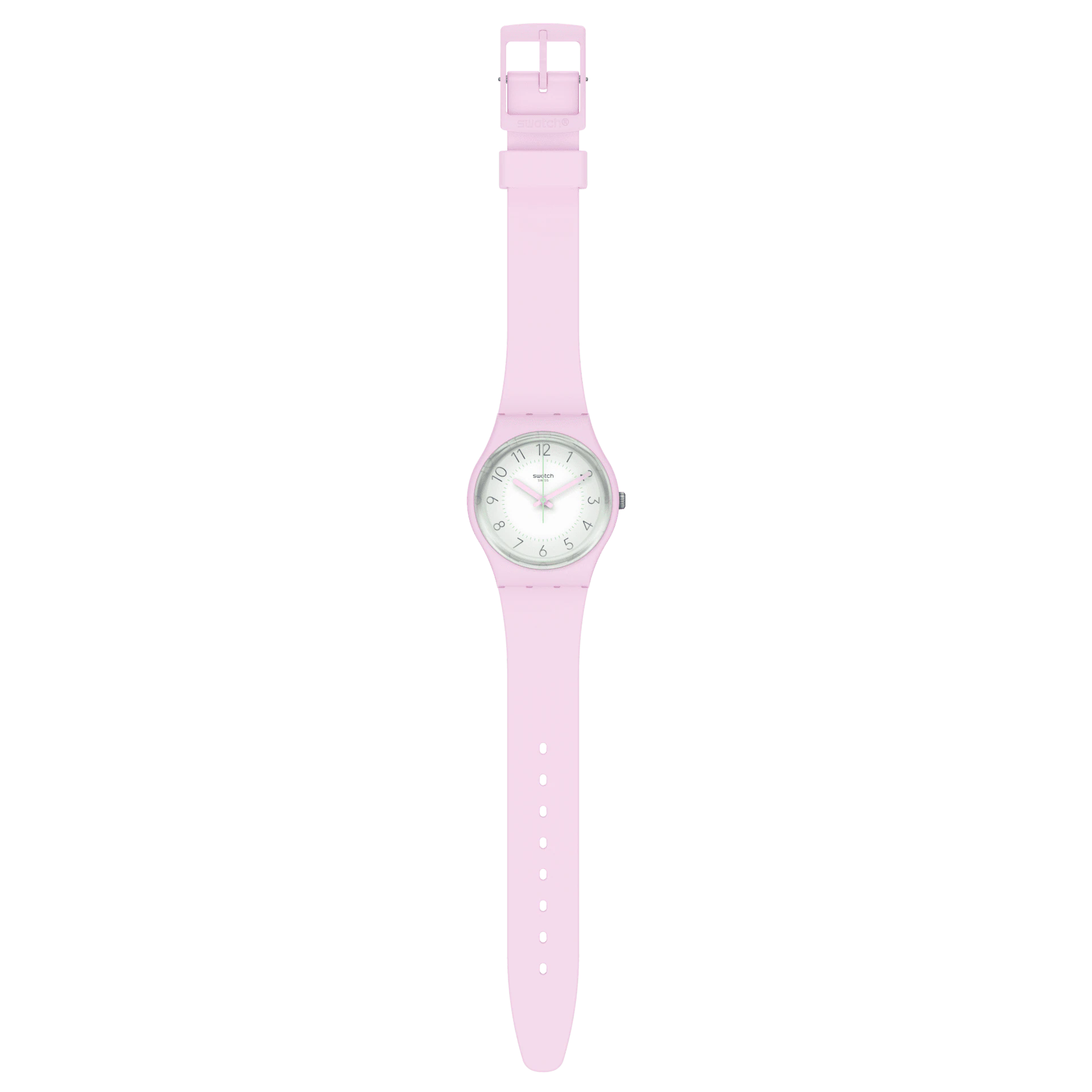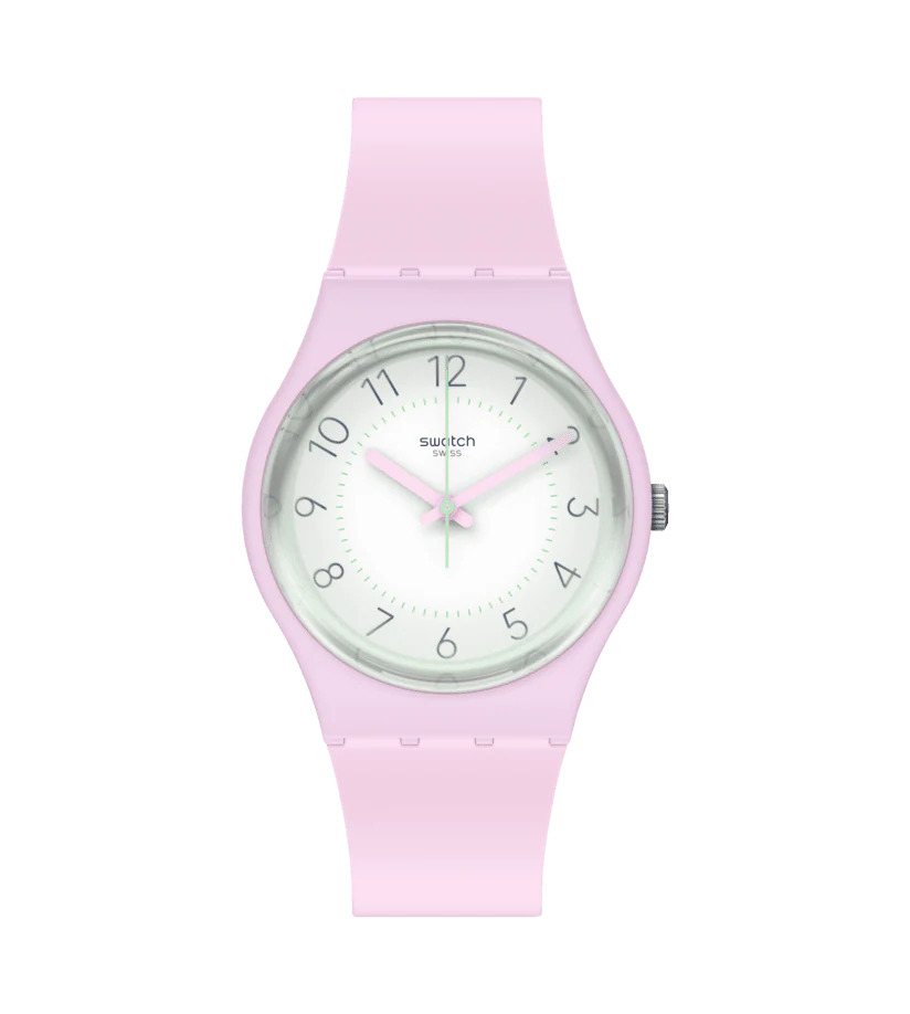 - Couleur : La montre présente une palette de couleurs printanières. Le bracelet, le cadran et le boîtier sont tous de couleur rose, évoquant la douceur et la fraîcheur du printemps. Le cadran est de couleur blanche, avec des index verts et un imprimé vert clair en dégradé sur le verre, ajoutant une touche de couleur et de dynamisme à l'ensemble.