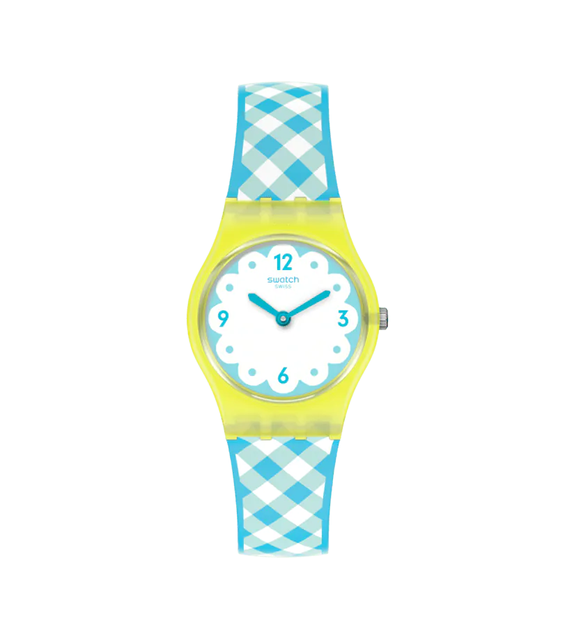 Cette montre élégante comprend un bracelet en silicone avec motif à carreaux bleu clair et blanc, ainsi qu'un charmant cadran bleu clair avec un imprimé blanc.