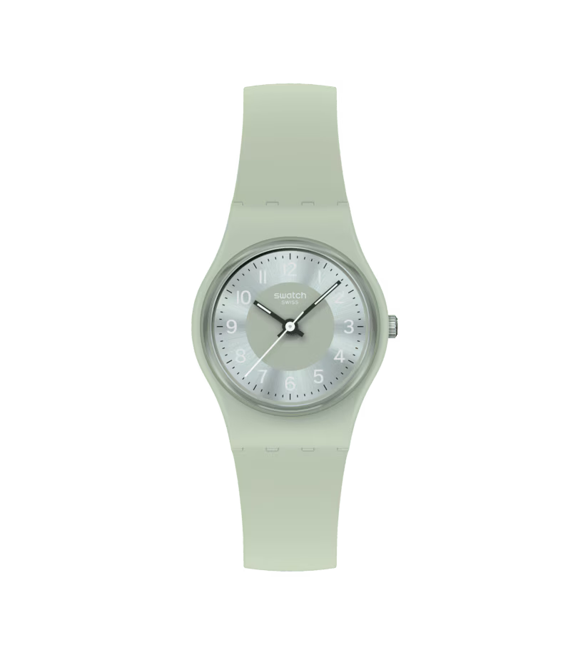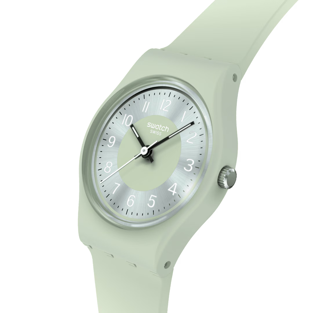 Cette petite montre possède un cadran brossé soleil vert clair décoré d’un rond vert au centre, de chiffres blancs et d’une minuterie noire – tous imprimés. Les aiguilles des heures et des minutes noires qui brillent dans l’obscurité et l’aiguille des secondes blanche donnent l’heure. Le boîtier vert mat s'associe à un bracelet mat dégradé vert et vert clair, avec une boucle et un passant mats vert clair.