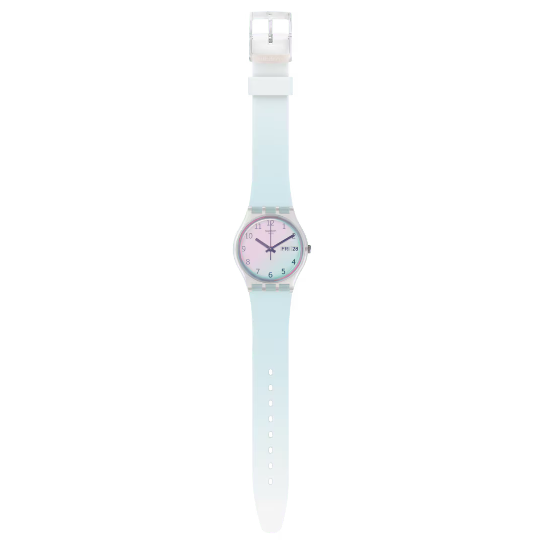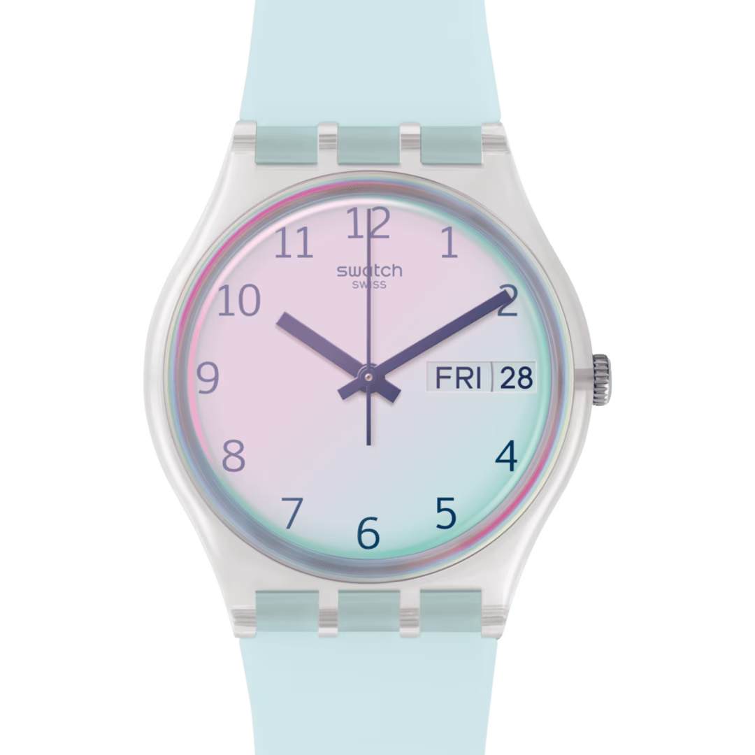 L’ULTRACIEL (GE713) bleu ciel a la pureté d’un ciel sans nuage. Son bracelet bleu clair fait joliment ressortir le blanc de son cadran, orné d’un verre Swatch Solar Spectrum bleu clair.