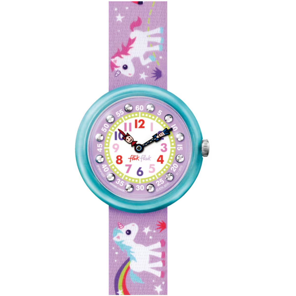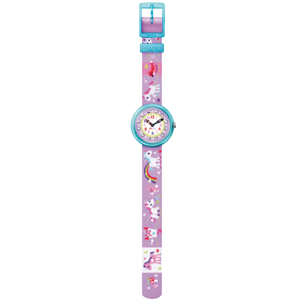 La montre pour enfants pédagogique MAGICAL UNICORNS est une montre ludique et éducative qui permet aux enfants d'apprendre à lire l'heure tout en découvrant un univers enchanté avec une forêt violette peuplée de lapins et d'un arc-en-ciel.